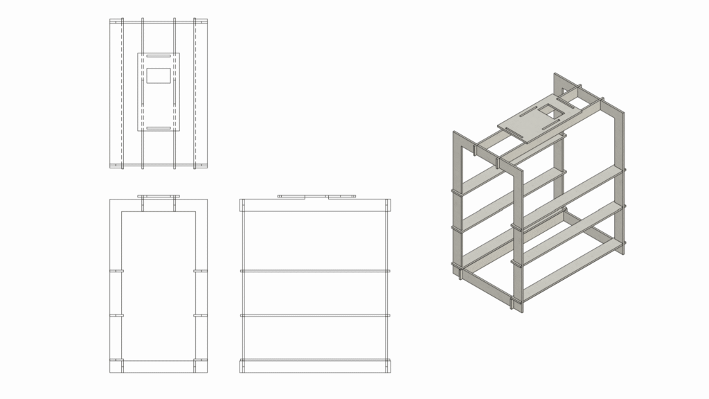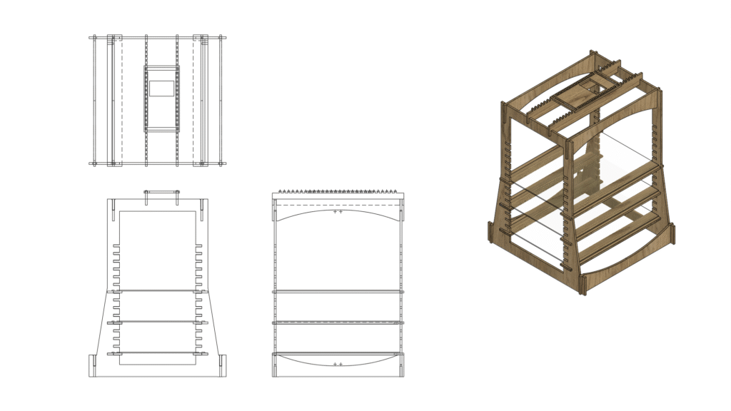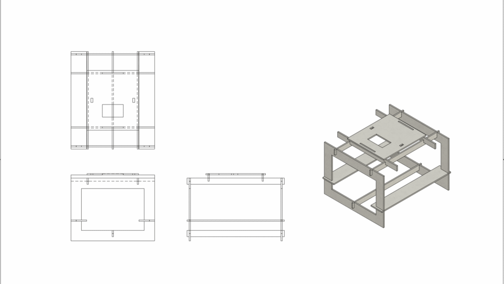 To address the objective of the stand being easily replicated, I proposed for it to be entirely digitally fabricated through laser cutting plywood. This was to provide users access to the open source vector files and material requirements that are of standard sizes in hardware and art stores. This would also provide sufficient constraints in construction of the stand to allow for modularity that would aid in making it portable and easy to assemble.