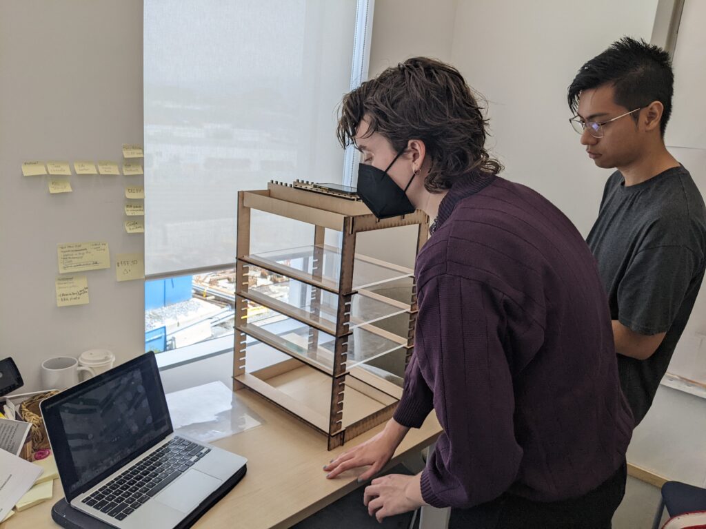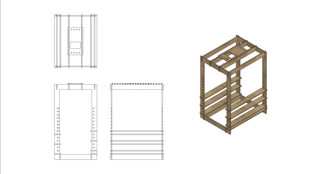 The main design challenges were addressing stability—a common trade-off for a sleek profile—and improving the loose tolerance of the joinery. To solve this, the team added support braces to the top corners and created a wider, tapered base.