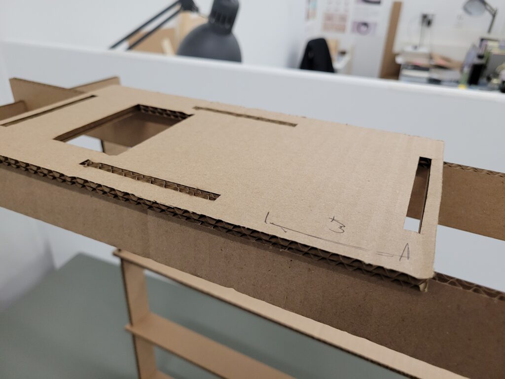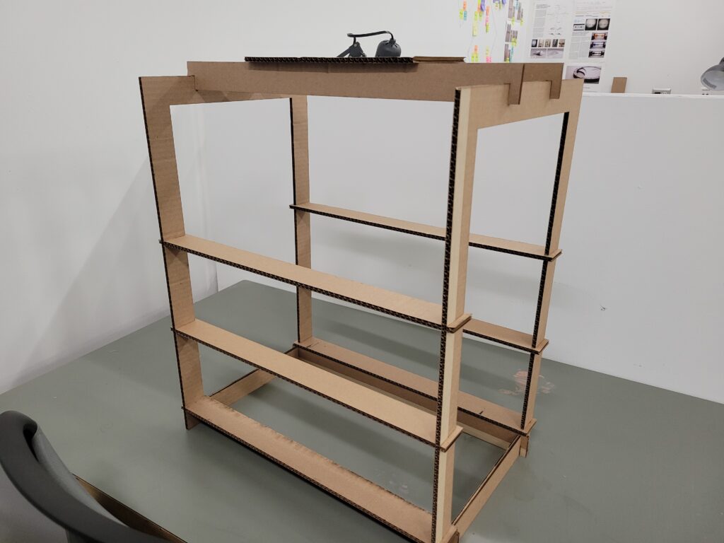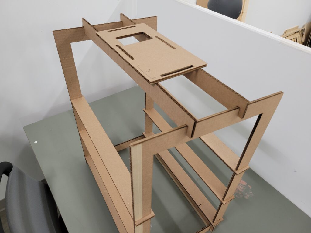 The first two cardboard prototypes established the basic structure, including the frame, braces, and a single beam for each glass plane. Feedback on these initial designs led to three key modifications: