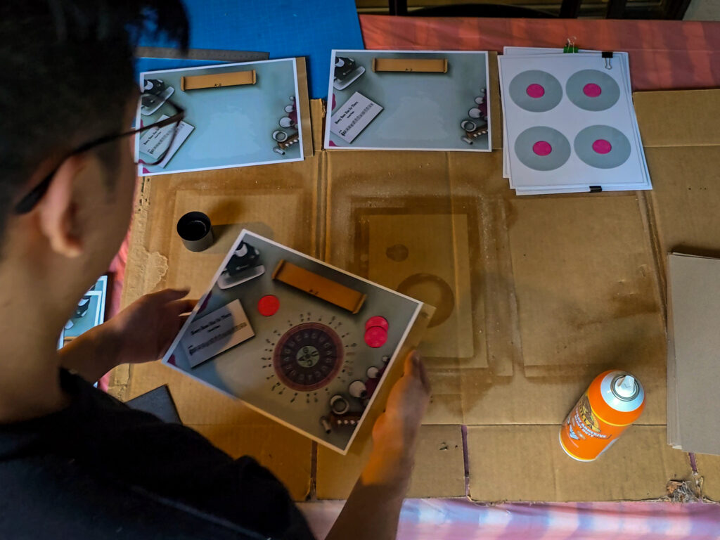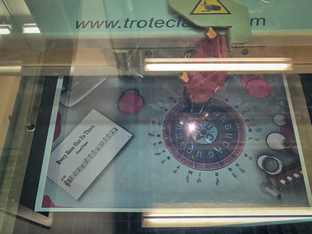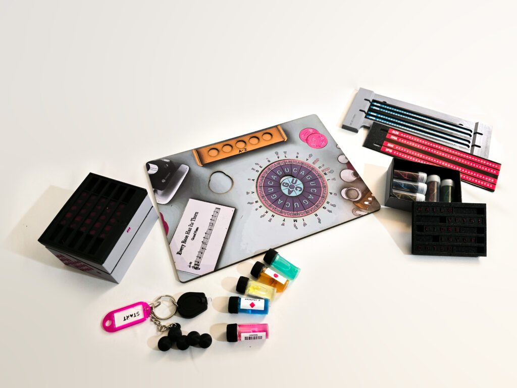 The project started with an initial prototype pinned to the board above. This concept of a tabletop escape room went through several iterations throughout six months. I proposed that most components be digitally fabricated through 3D printing and laser cutting in order to have the fabrication of the kits be replicable at any time with the appropriate tools.