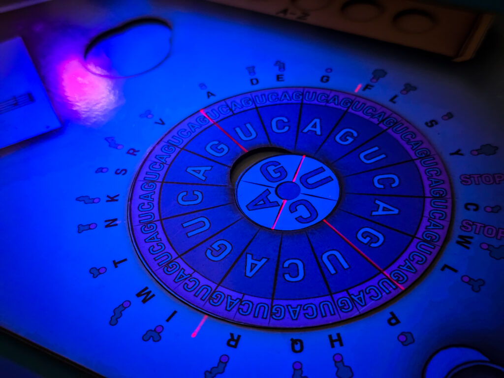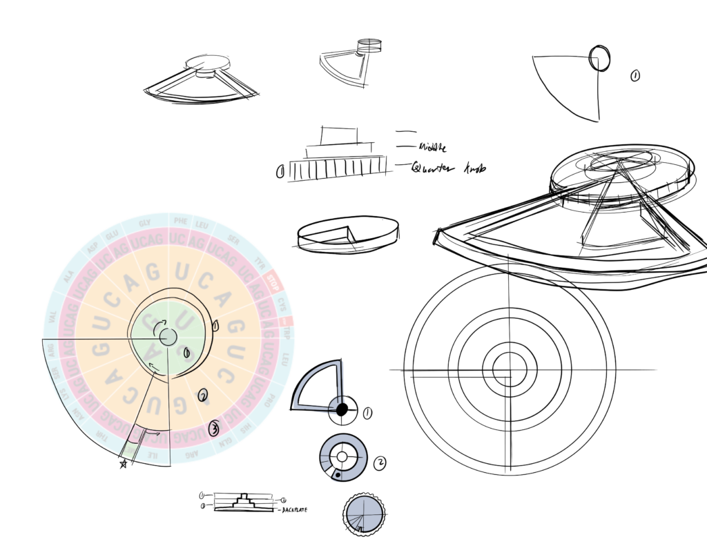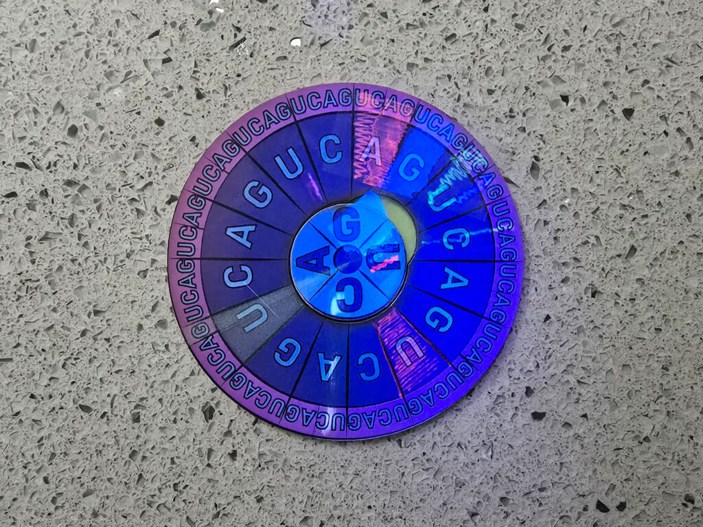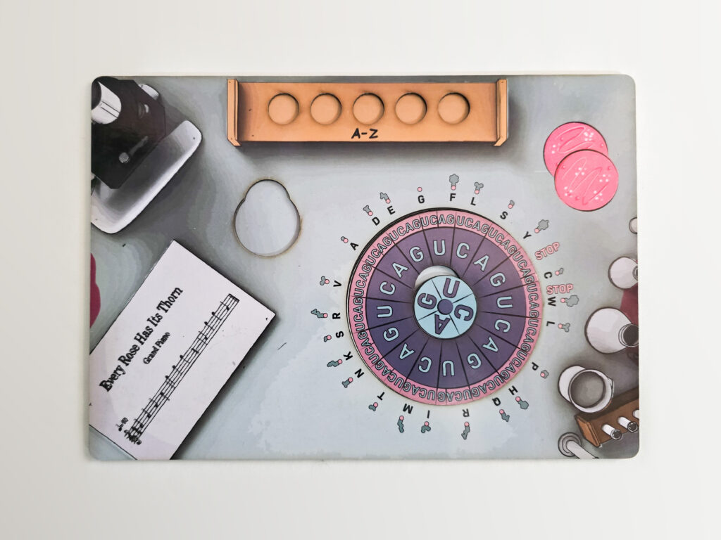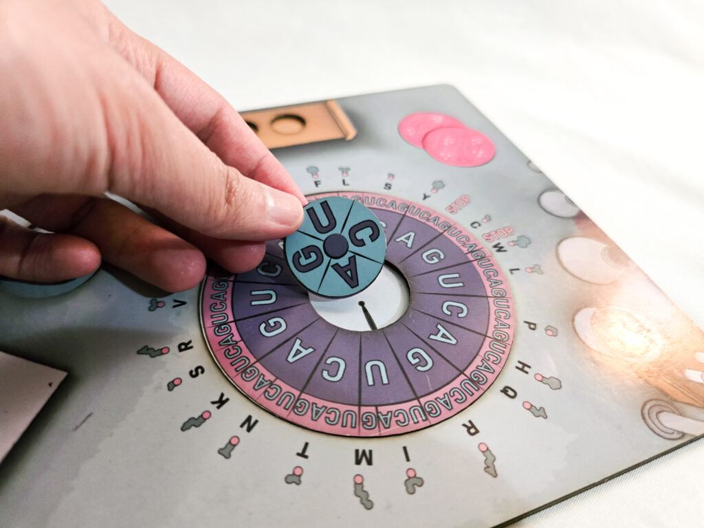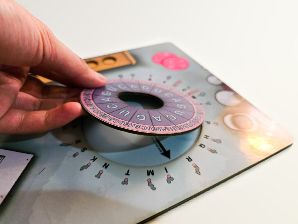 The codon wheel is divided into sections where the inner-most section hides itself as a petri dish elsewhere on the board. When players put the two pieces together, they complete the codon wheel to be referenced in acquiring the codes for the puzzle box.