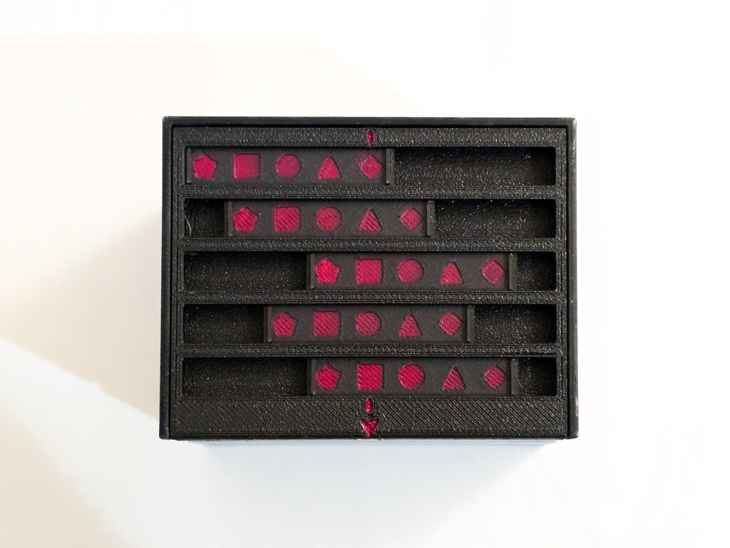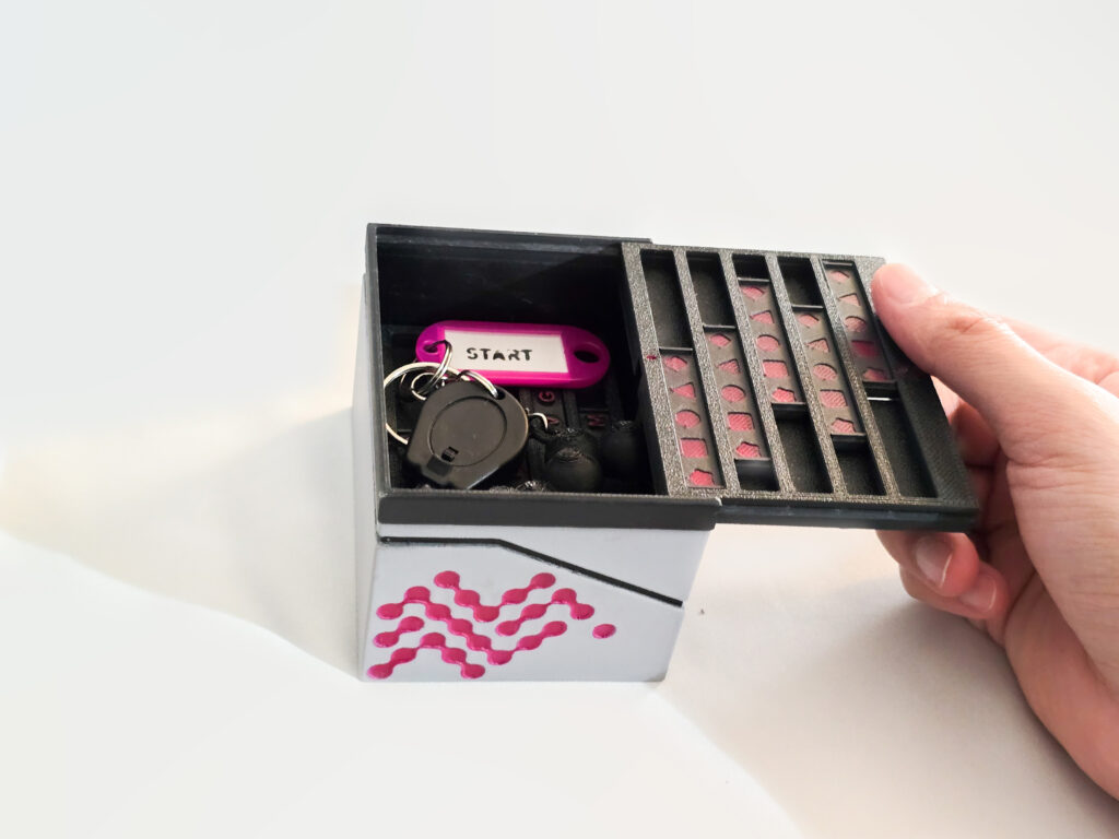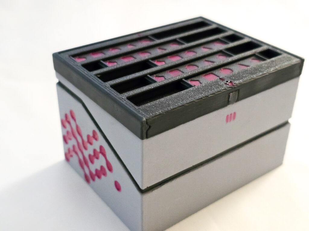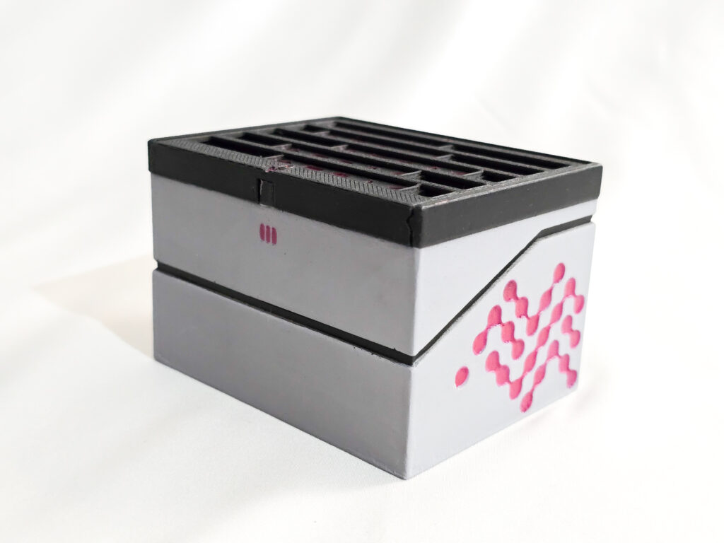 The construction is similar to the larger box where the contact surfaces for the sliding plates and magnet base were 3D printed using a textured bed plate for additional tactile and auditory feedback. It also makes use of magnets similar to its larger counterpart. Unlike its counterpart, however, this smaller puzzle box sports shelled out grooves on the inside to hold the tubes housing the options for the cure to the evil scientist's poison, represented by the different coloured DNA Helix.