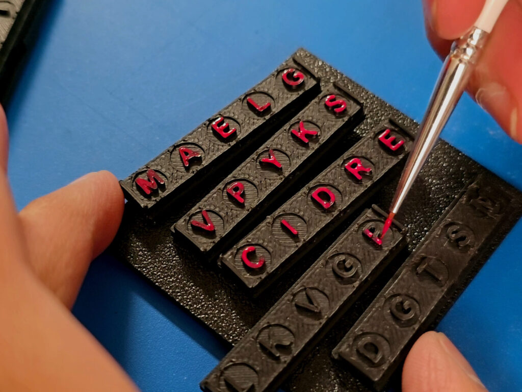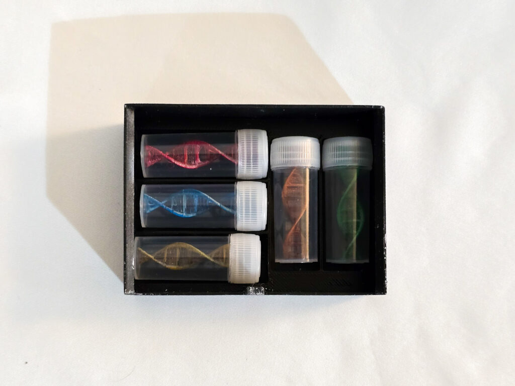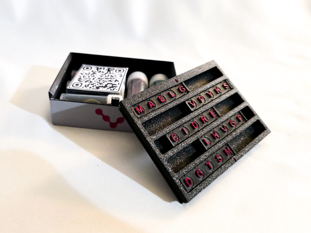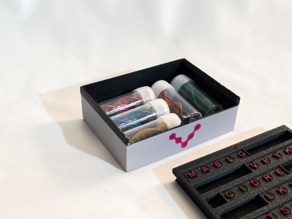The construction is similar to the larger box where the contact surfaces for the sliding plates and magnet base were 3D printed using a textured bed plate for additional tactile and auditory feedback. It also makes use of magnets similar to its larger counterpart. Unlike its counterpart, however, this smaller puzzle box sports shelled out grooves on the inside to hold the tubes housing the options for the cure to the evil scientist's poison, represented by the different coloured DNA Helix.