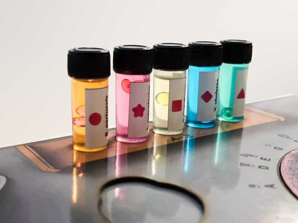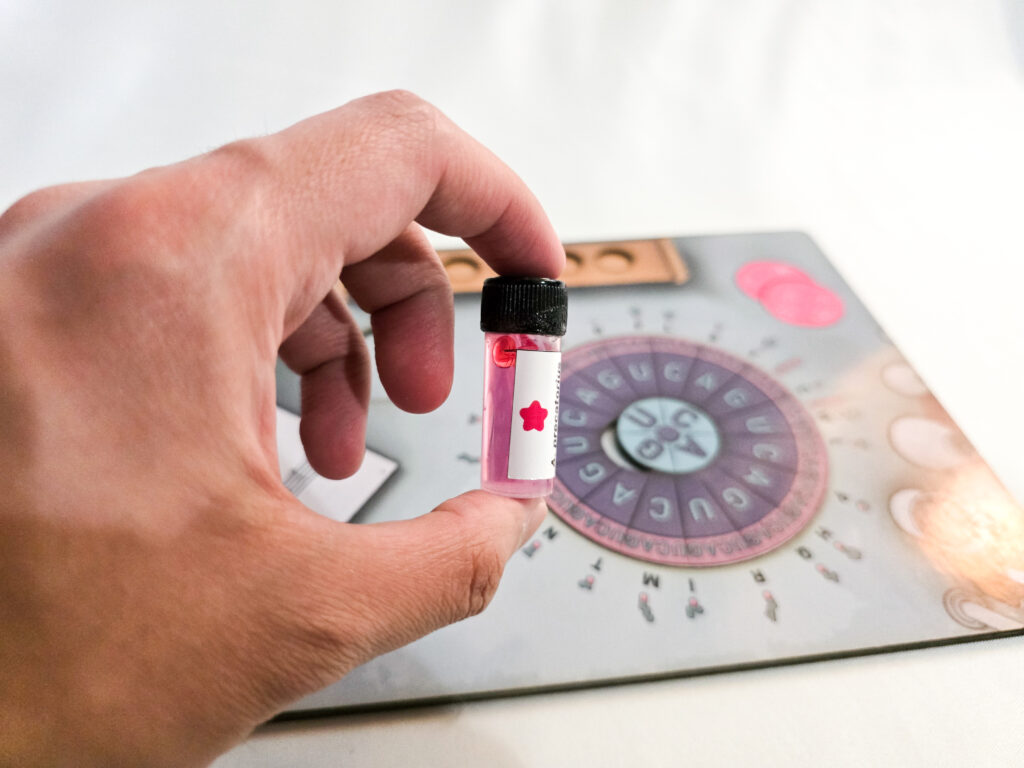 Coloured vials with bacteria names and shapes can be found with the clue board and it is up to players to decipher the order in which these vials go on the board. The sequence dictates the code needed to open the first puzzle box.