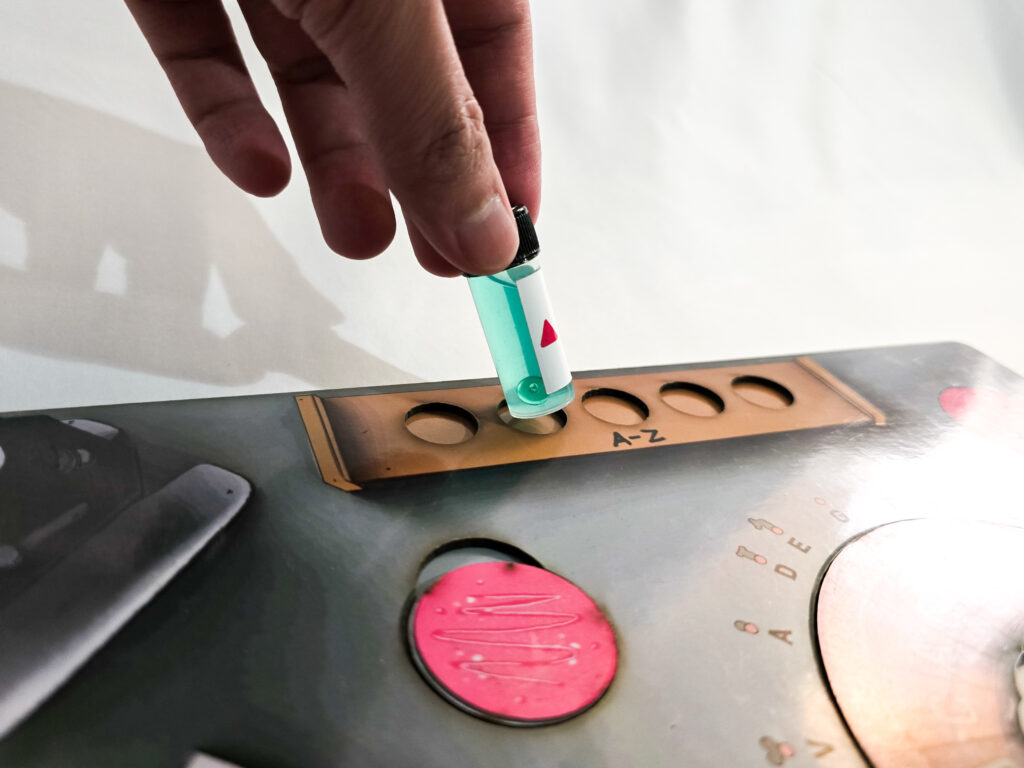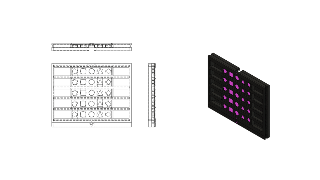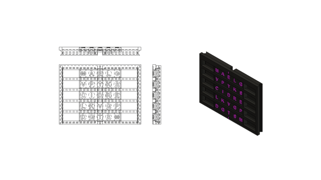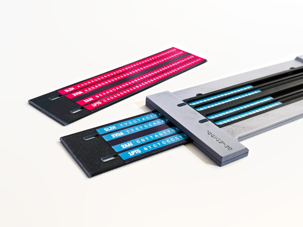 This holds the DNA/RNA sequences used to decode the final stages of the game. It helps to swap out DNA slides with RNA slides, depending on the need of the workshop facilitator. The sliding mechanism, unexpectedly also helped in visual alignment for players to not get lost amidst the sea of letters when finding the code, as was evidenced in the playtesting with the internal team.