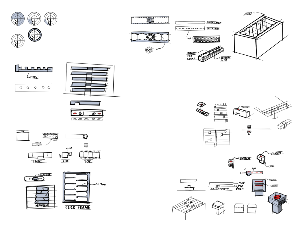 The contact surfaces for both the sliding plates and the magnet base below them were 3D printed using a textured bed plate in order to have a gritty feeling when sliding against each other for both tactile and auditory feedback, resulting in a satisfying clicking sound. Magnets inside these components are also used to align the gaps to the correct placement for a smoother pull out.