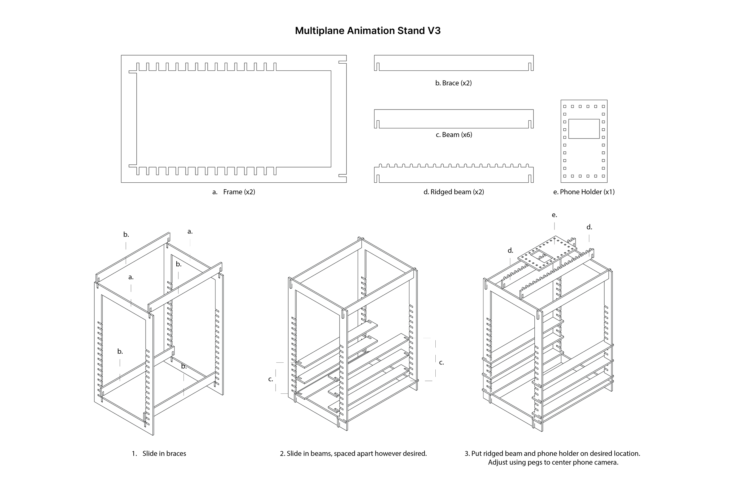To design an accessible, user-friendly, and modular multiplane animation stand that can be manufactured in a local makerspace, offering artists an easy-to-assemble, highly portable setup for both studio and outdoor shooting, thus lowering the barrier to entry for multiplane animation.